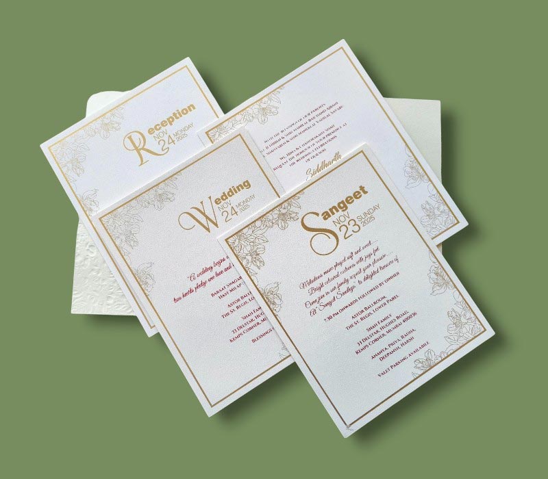 For pre-made cards, printing and general design charges will be extra. Customizations such as logos, invitation card add-ons (e.g., Paper Seal/Wax, Vellum Paper, Dori, Normal/Acrylic/EP Stickers, etc.) will incur additiona